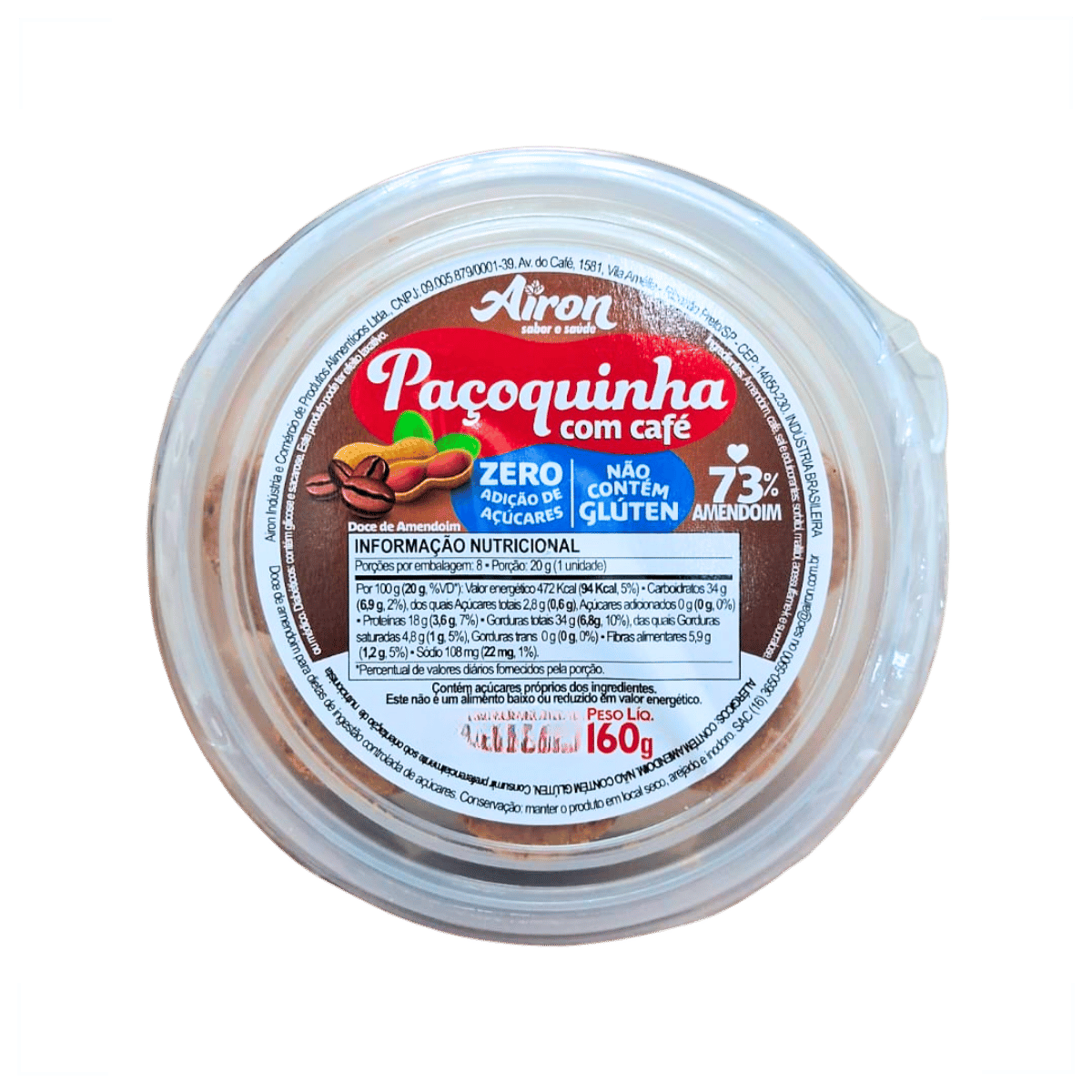 A Paçoquinha Zero com Café Airon 160g é a escolha ideal para quem deseja saborear o autêntico gosto do amendoim combinado com café, de forma saudável, sem glúten, sem lactose e sem adição de açúcares. Uma opção perfeita para quem busca energia e sabor em um snack prático, sem comprometer a alimentação equilibrada.